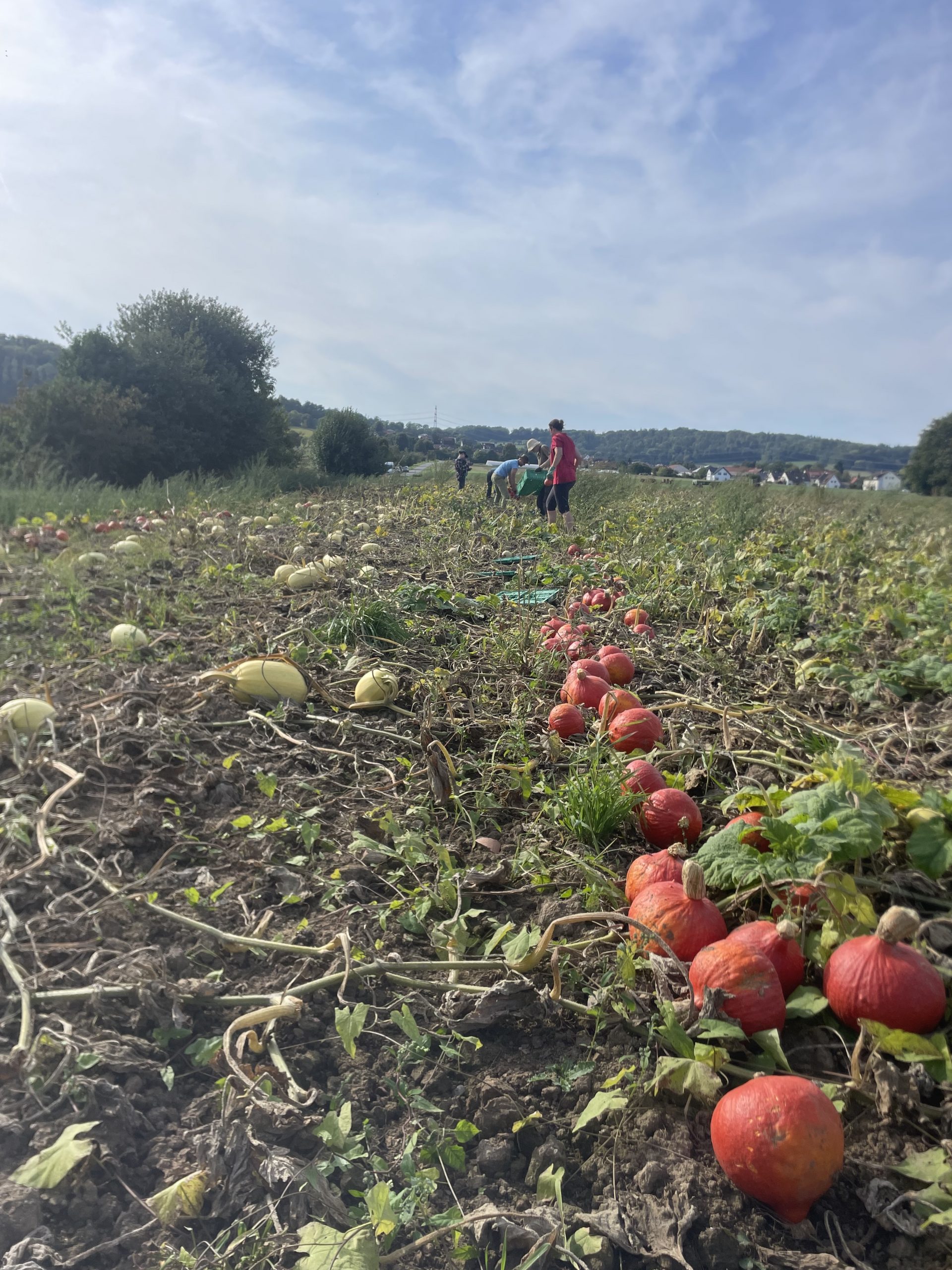 Am Mittag versammelte sich eine engagierte Gruppe von Helfer*innen auf dem Acker, um tatkräftig mit anzupacken. Geerntet wurden große Mengen Sellerie sowie drei verschiedene Sorten Kürbisse, die dank des sonnigen Spätsommers in diesem Jahr besonders gut gedeihen konnten. Neben der Ernte wurde auch fleißig Unkraut gejätet, um die verbleibenden Kulturen zu pflegen und ihnen beste Wachstumsbedingungen zu ermöglichen.